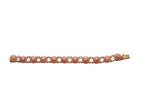 bracelet with coral paste cameos, entirely handmade by Sicilian master craftsmen; filigree processing on brass.