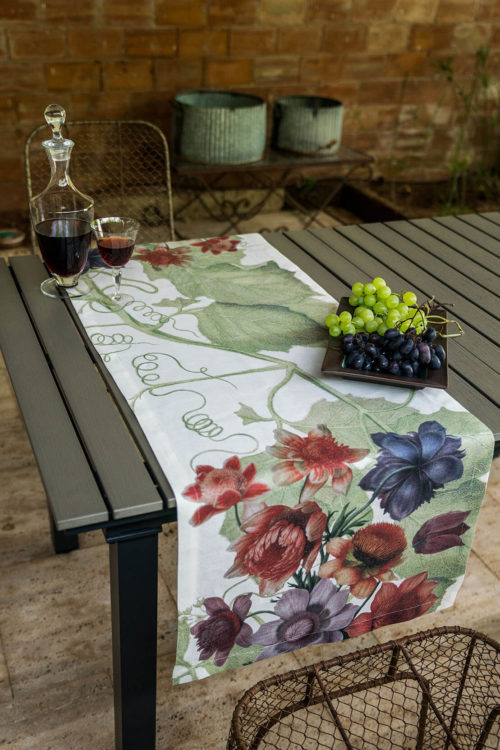 Table runner in pure Italian high quality linen with floral pattern. Measurements: 50×150 cm. / 19.5 “W, 59” L Linen 100% Machine washable max. 40 ° C
