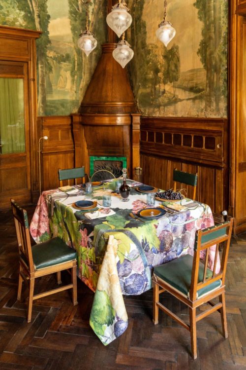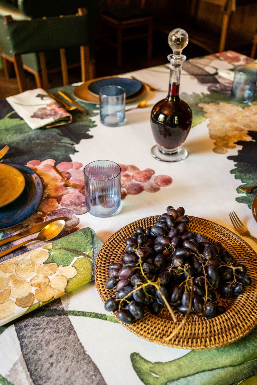 Tablecloths with colored grape pattern, on pure linen fabric.