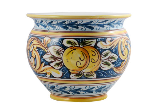 Glazed ceramic cachepot, floral decoration on a blue background and lemons.