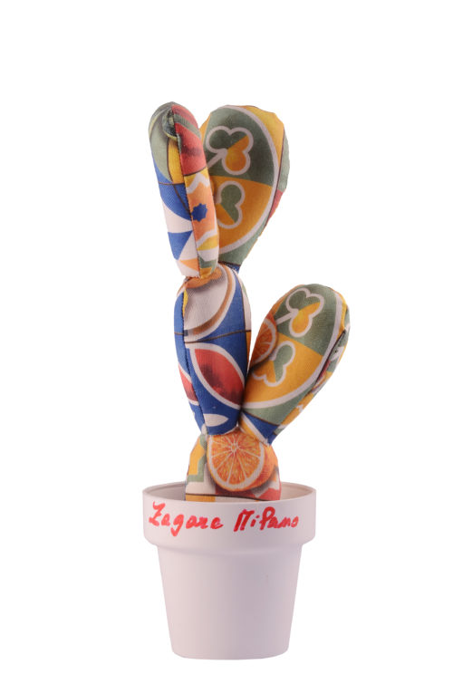 Fabric cactus, patchwork and buried in lava stone.