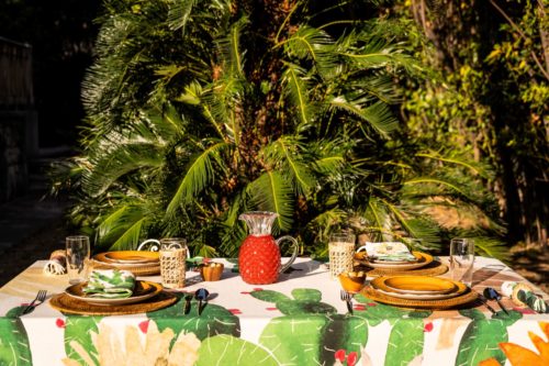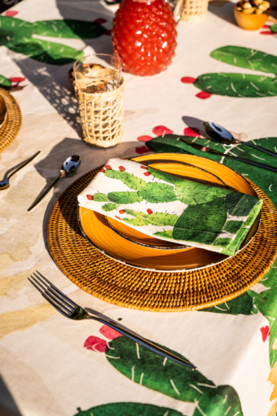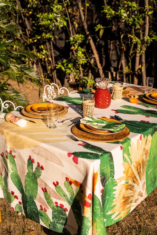 Tablecloths with colored prickly pear pattern on pure linen fabric.