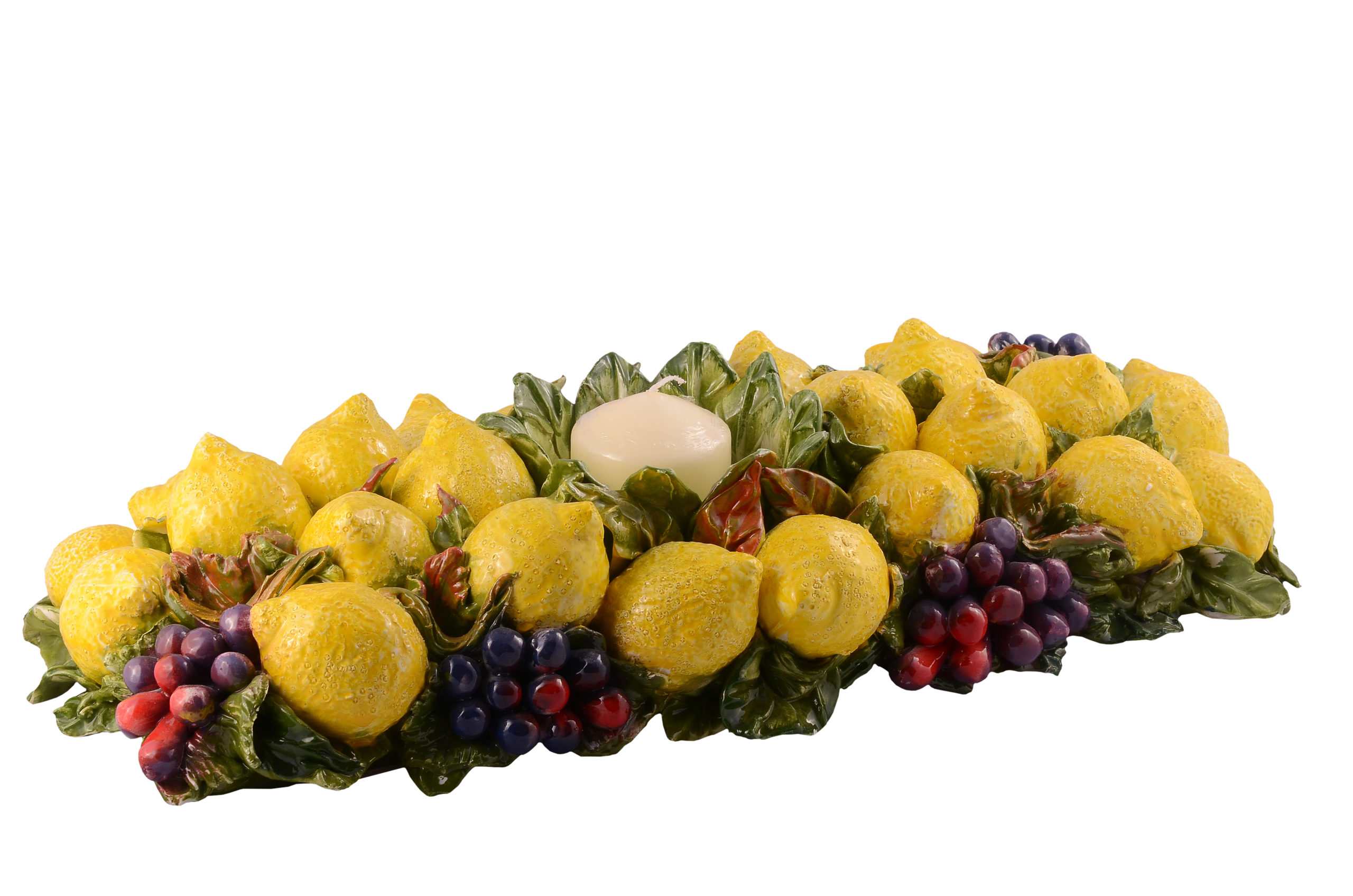 Centrotavola decoro limoni ed uva, in ceramica smaltata.