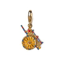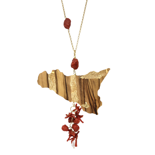 Collana con elemento in legno d’ulivo (Sicilia) e sassi e rami di corallo rosso, impreziosito da foglia oro 24k. Montatura in Argento 925 placcato oro giallo.