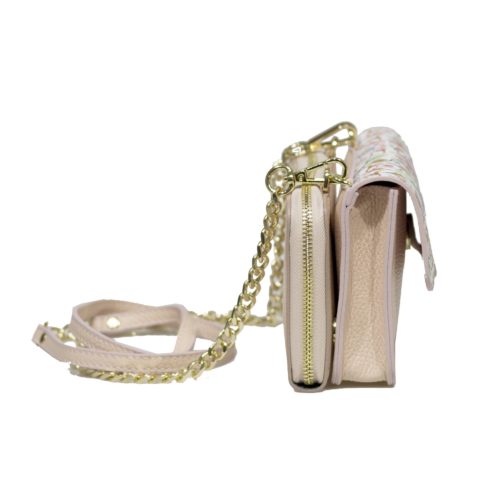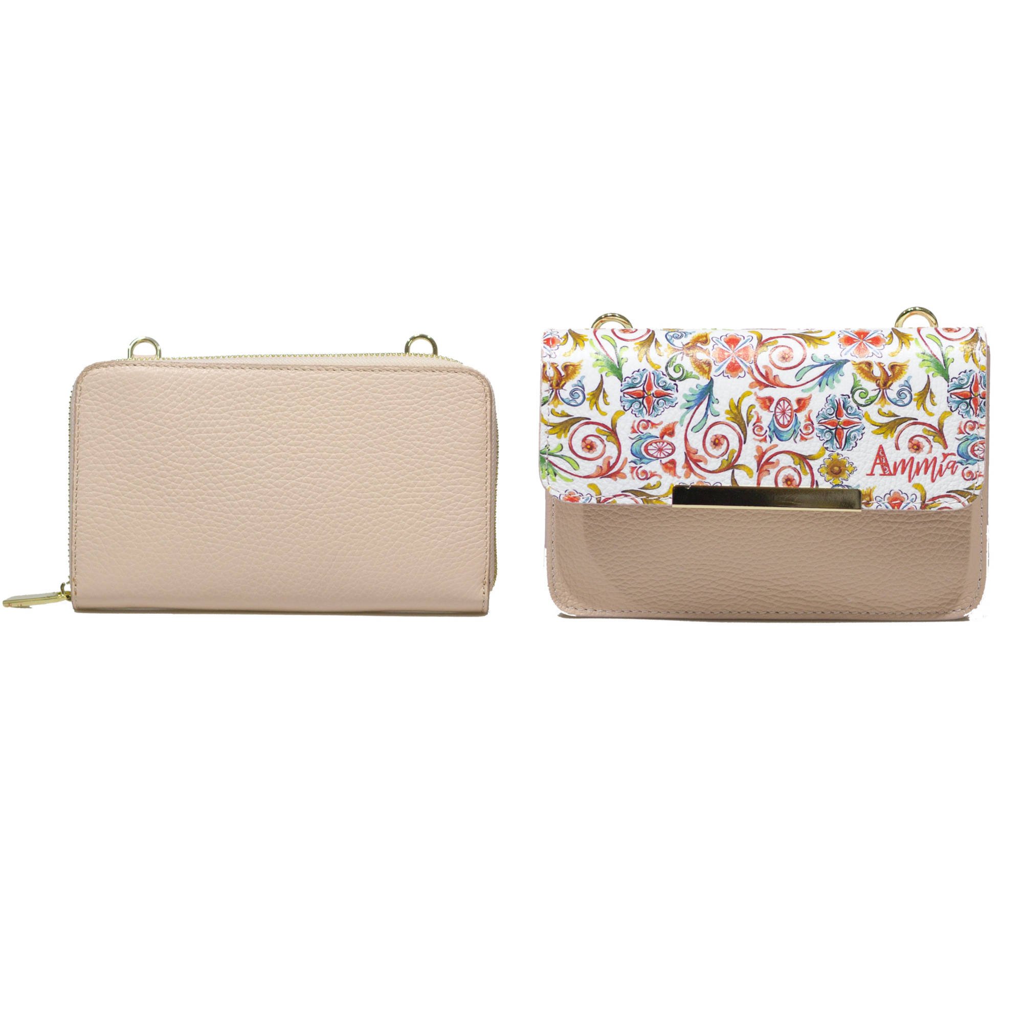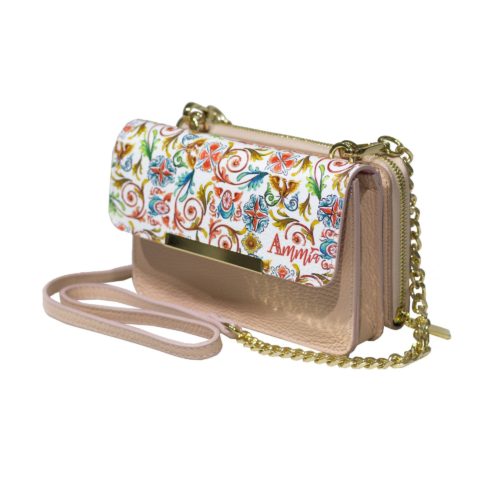 Doppia tracollina LUCKY linea “Scaramanzia” in pelle con decori scaramantici  e portafortuna tipici della tradizione siciliana. Borsa a tracolla in pelle, formata da una minibag e un portafoglio staccabili. La minibag frontale ha una pattina decorata con elementi scaramantici, è ampia e presenta una tasca interna con zip. Il portafoglio è in pelle e presenta vari scomparti all’interno, comodo anche come portacellulare. Possono essere usati separatamente come pochette a mano o essere uniti dalla tracollina con catenina dorata. Formato comodo e versatile, ideale sia per una passeggiata che per un evento elegante.