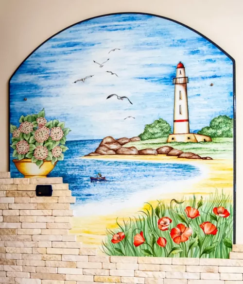 Pannello Decorativo in Pietra Lavica con decoro Vista Mare; interamente realizzato e decorato a mano da mastri artigiani siciliani.